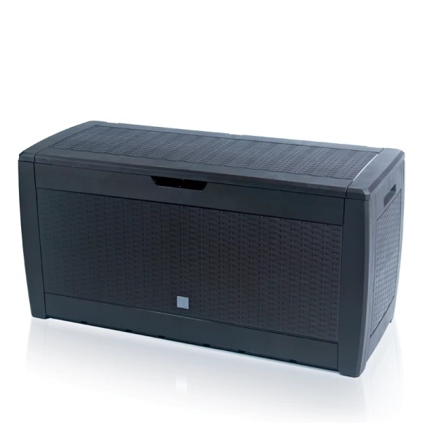Die Gartenbox ist nicht nur praktisch, sondern sie überzeugt auch mit ihrem dekorativen Design, das in die Außenräume optisch gut passt. Die Aufbewahrungsbox ist im Dekor Imitation von Naturholz erhältlich und die Seitenteile sind mit einer komplizierten Mosaikstruktur versehen, die von natürlichem Bambus und Rattangeflecht inspiriert ist.