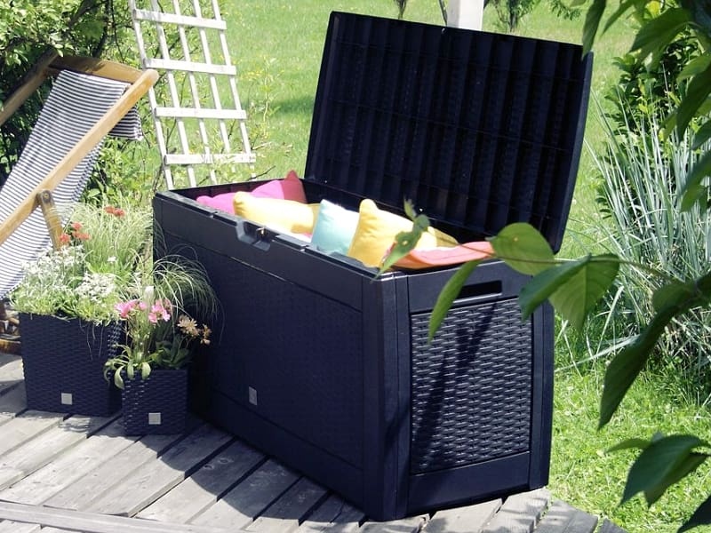 Die Aufbewahrungsbox aus Kunststoff ist pflegeleicht. Im Winter empfiehlt sich eine Lagerung im Innenraum, um Schäden an der Konstruktion zu verhindern.