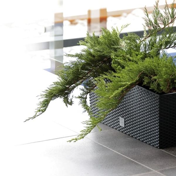 Der anthrazitfarbene Blumenkasten mit Bewässerungssystem und Rattan-Look sieht ästhetisch aus und passt geschmacksvoll in welchen Innenraum auch immer.