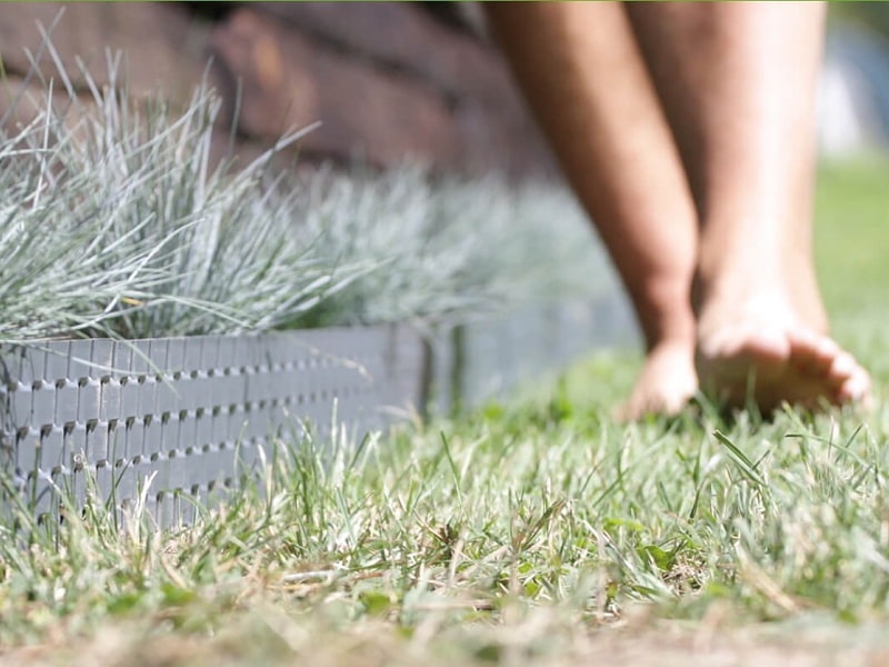 3. Die zusammengesteckte Rasenkante/Palisade richtig im Boden befestigen, um Rasenwuchs an unerwünschten Stellen zu verhindern.