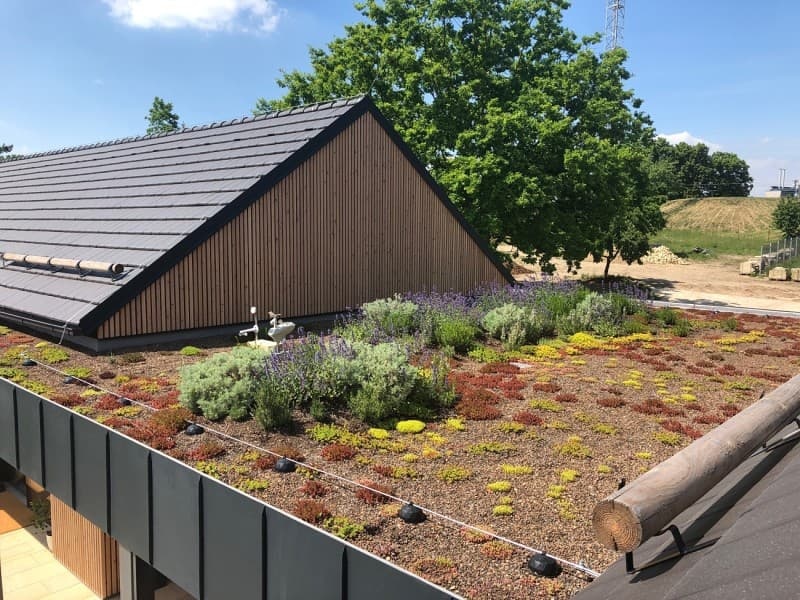 Die Drainageplatte ersetzt im Standardaufbau einer extensiven Dachbegrünung zwei notwendige Schichten: die wasserspeichernde Noppenfolie und die Filtergeotextilien-Schicht.