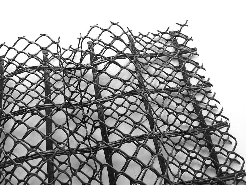 Die Geomatte besteht aus schwarzen Polypropylennetzen, die entsprechend miteinander verbunden sind und einen ca. 3 cm hohen Rückhalteraum für die Erde ausbilden, die dadurch bewehrt wird.