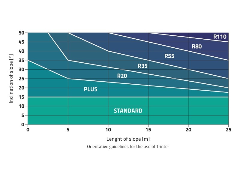 Die Geomatten werden für alle Böschungsneigungen eingesetzt, bei denen eine Begrünung noch vernünftig ist. In der Praxis liegt die Neigungsgrenze bei 45 Grad (im Einzelfall bis zu 50°). Bei steileren Hängen lässt sich das für das Rasenwachstum notwendige Wasser schwer aufhalten.