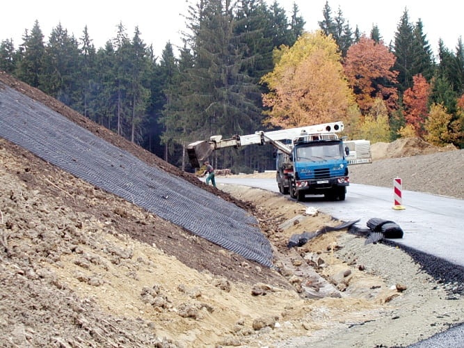 Im Unterschied zu den kurzfristig schützenden Naturprodukten (Erosionsschutznetze und -matten), die nach einiger Zeit abgebaut werden, wird die Geomatte aus Kunststoff zum permanenten Bestandteil der Böschung und funktioniert praktisch uneingeschränkt.