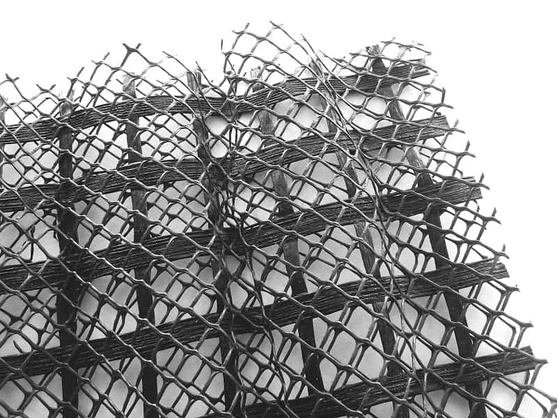Die Geomatte besteht aus schwarzen Polypropylennetzen, die entsprechend miteinander verbunden sind und einen ca. 3 cm hohen Rückhalteraum für die Erde ausbilden, die dadurch bewehrt wird.