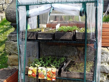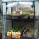 Foliengewächshaus Balkon. Eisenrahmen mit Oberflächenbearbeitung (grüne Epoxidfarbe). Die durchsichtige Abdeckung mit Doppelreißverschluss erleichtert den Zugang.