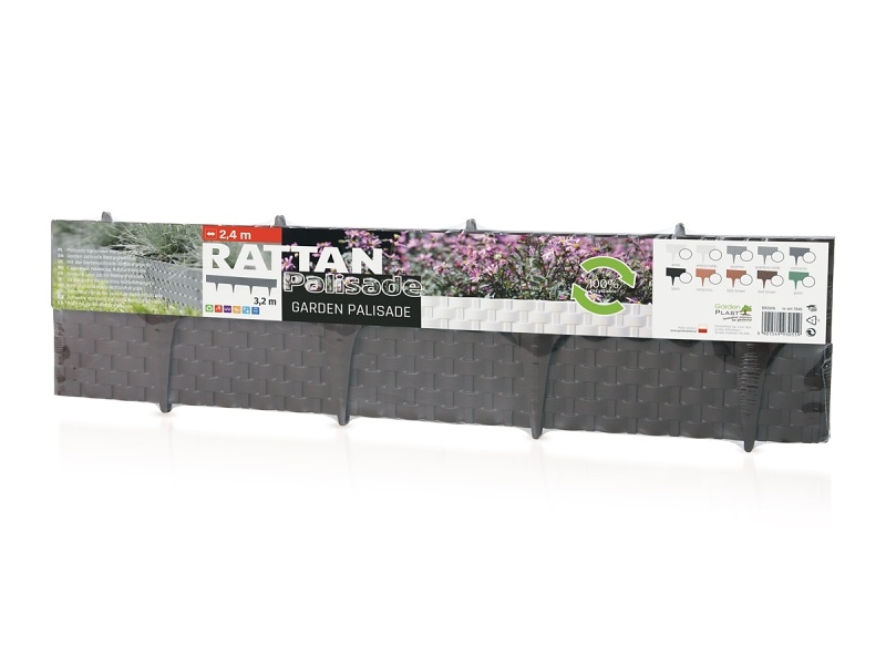 Die Gartenpalisade wird aus strapazierfähigem Kunststoff (Polypropylen- und Polyethylengemisch) hergestellt, der gegen Witterung, Frost oder UV-Strahlung beständig ist. Sie ist jedoch nicht von Rasenmähern befahrbar, deren Messer die Gartenpalisade beschädigen könnten.