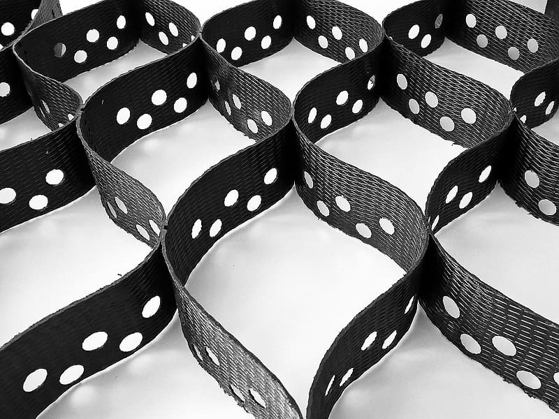 Die Geozellen werden aus texturierten und perforierten Kunststoffstreifen aus Hart-Polyethylen (HDPE) hergestellt. Die Streifen von bestimmter Höhe werden mit Ultraschall zusammengeschweißt und bilden ein wabenähnliches System.