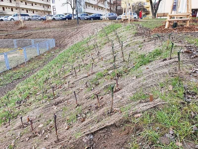 Jutenetze können mit Unkrautvlies oder aus Biomasse hergestelltem Bio-Mulchvlies kombiniert werden und verhindern so das Wachstum von Unkraut an mit Sträuchern oder Stauden bepflanzten Gartenböschungen.