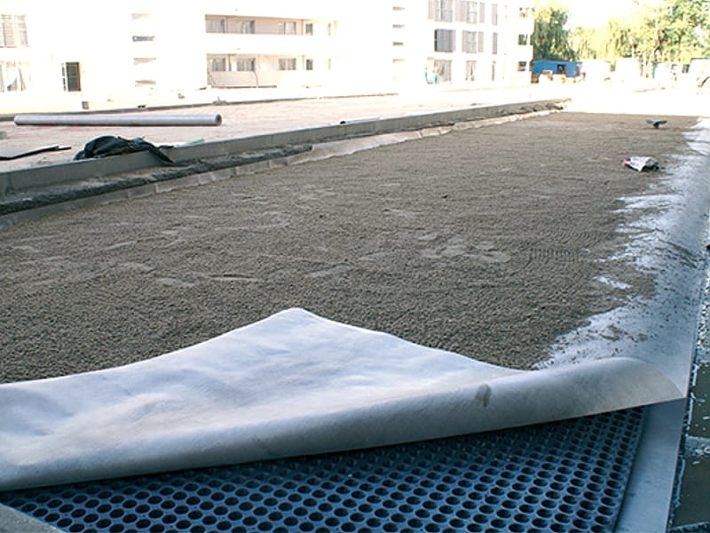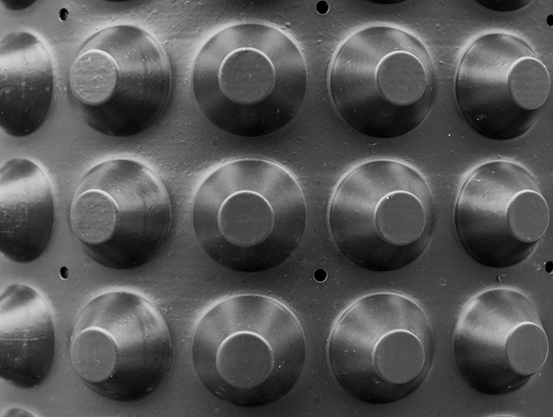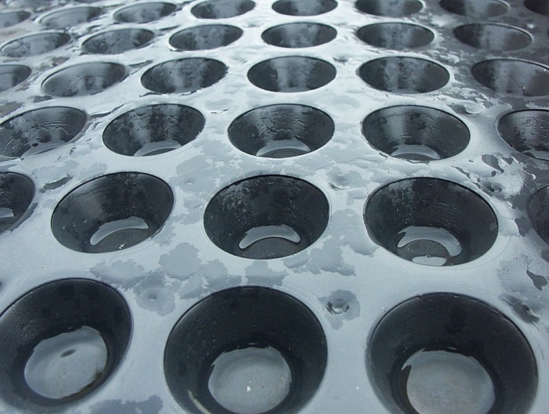 Die Noppenfolie besteht, im Profil gesehen, aus halb kugelförmigen Zacken, den. sog. Noppen, die 8 mm hoch sind, wobei sich auf einer Fläche mit 1m2 mindestens 1800 Noppen befinden (in der Basisvariante, die zugleich am häufigsten verwendet wird). Die Noppenfolie ist aus einem widerstandsfähigen Material hergestellt (HDPE), welches schimmelresistent ist, üblichen Chemikalien sowie Salzen standhält und UV-beständig ist. Widerstandsfähig für das Temperaturspektrum von –40 bis +80°C. Beinhaltet keine Gefahrenstoffe (ist unschädlich für Trinkwasser). Die Lebensdauer der Noppenfolie beträgt unter üblichen Bedingungen (Erdmasse oder Aufschüttung mit einem ph-Wert zwischen 4 und 9 und einer Temperatur von < 25°C) mindestens 25 Jahre. Die Volumenkapazität des Freiraums zwischen den Noppen beläuft sich auf ca. 5,3 l/m2 Noppenfolienfläche.