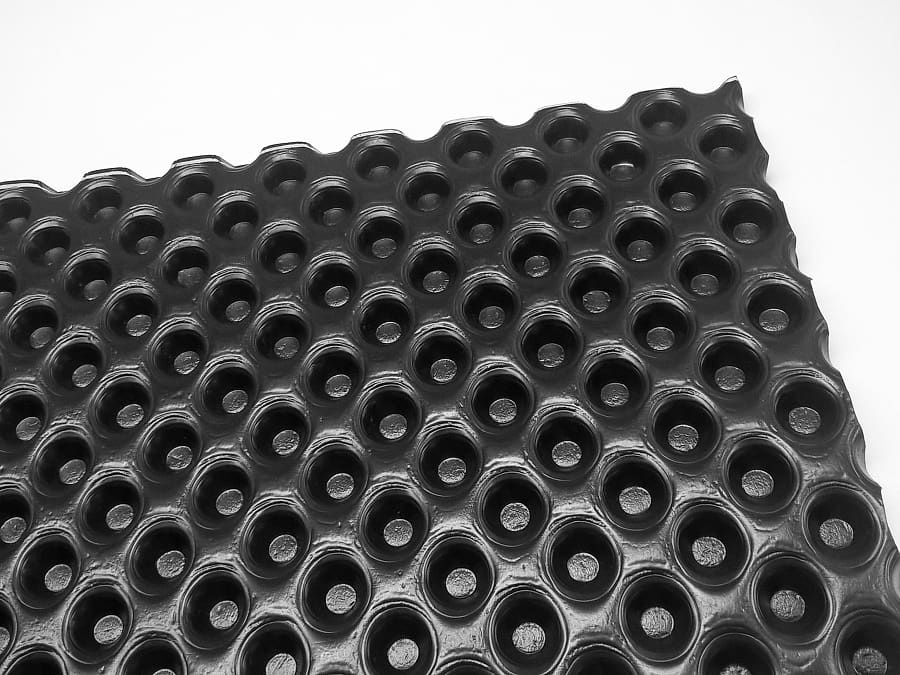 Die Noppenfolie besteht aus hochdichtem strapazierfähigem Polyethylen (HDPE) mit Beständigkeit gegen Verrottung, übliche chemische Substanzen, Salze und UV-Strahlung. Sie ist temperaturbeständig im Bereich von -40 °C bis +80 °C. Enthält keine Schadstoffe und ist trinkwasserun­bedenklich.