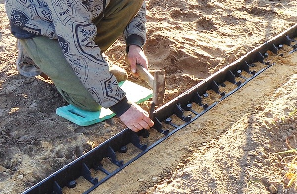 Die Rasenkanten aus Kunststoff werden mit 25 cm langen Erdnägeln befestigt (standardmäßig nicht im Lieferumfang enthalten). Je nach der Form werden pro Meter Rasenkante jeweils 2–3 Erdnägel, bei steilen Bögen jeweils 5–6 Erdnägel benötigt. Zum Einbau sind übliche Gartenwerkzeuge ausreichend (Spaten, Hammer, Säge, Zange …). Die Kanten können ausgebaut und später wieder eingebaut werden.