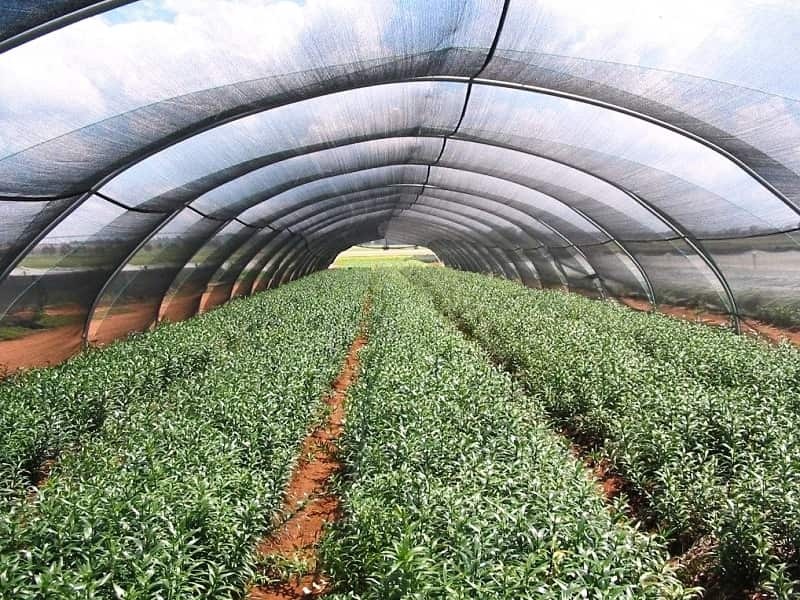 Das Schattiernetz wird aus hochdichtem Polyethylen (HDPE) hergestellt. Das verwendete Material ist gegen UV-Strahlung, Wind und Frost beständig. Daher können Schattiernetze am Gewächshaus sowohl von innen, als auch von außen angebracht werden, wo sie den Witterungsverhältnissen zuverlässig trotzen. Gleichzeitig sind die Schattiernetze gegen Fäule, übliche chemische Prozesse und fliegende Schmutzpartikel beständig.