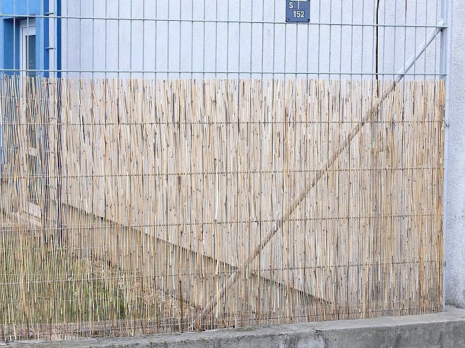 Die Schilfmatte eignet sich auch als Zaunverkleidung, es reicht nur, die Matte mit einem festen Bindedraht am bereits vorhandenen Zaun zu befestigen. Bei Bedarf lässt sich die Matte zurechtschneiden. Anschließend sind die Halme wieder mit Bindedraht zu verbinden, damit die Matte nicht auseinander fällt.