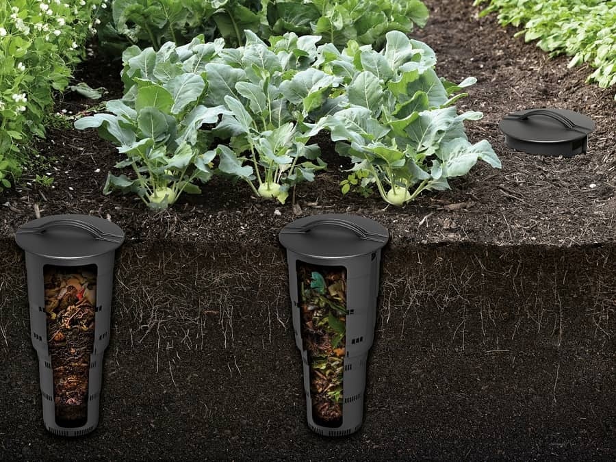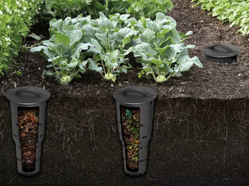 Über der Erde bleibt nur das obere Teil mit einem Deckel, wodurch der Gartenkomposter bequem mit weiterem organischem Material befüllt werden kann. Die sich zersetzenden Reste locken Regenwürmer und weitere kleine Lebewesen an, die zum Verrottungsprozess beitragen und den Boden mit wichtigen Nährstoffen anreichern.