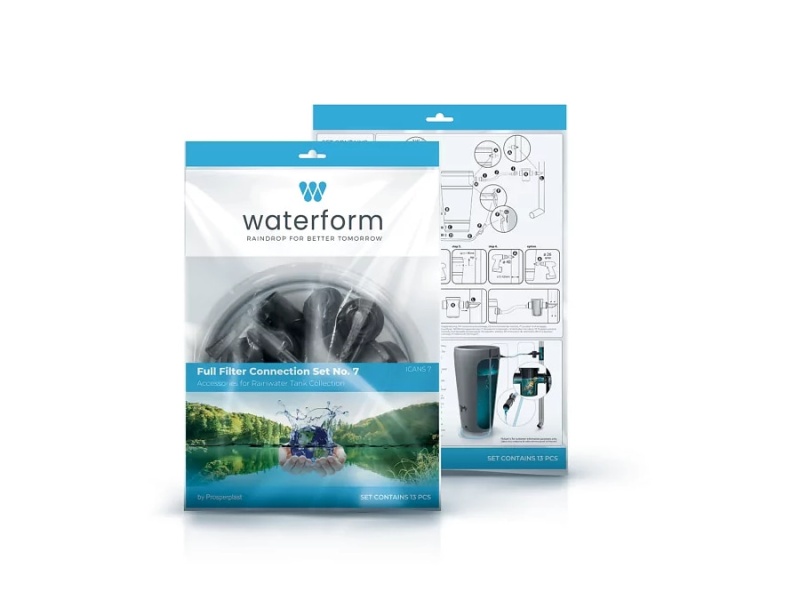 Sets mit Zubehör für Regenwasserbehälter der Produktserie Waterform (Hersteller Prosperplast). Die Sets enthalten Komponenten zum Auffangen und Sammeln, Zuführen und Ableiten von Regenwasser zu bzw. aus Regenwassertonnen.
